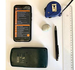 Öffne in der App „phyphox“ die akustische Stoppuhr (Zeitmessung). Hier wird die Schwelle 0,1 und Mindestverzögerung 0,1 für das Experiment verwendet. In der orangen Zeile, ganz oben, kann die akustische Stoppuhr pausiert und gestartet werden. Die akustische Stoppuhr soll erst kurz vor der Durchführung des Experimentes aktiviert werden. Bevor der Versuch durchgeführt wird, wird die Fallhöhe mit dem Rollmeter gemessen und notiert. Das Lineal wird auf den Tisch gelegt, so dass ein Teil des Lineals über die Tischkante blickt. Das Flugobjekt wird an die Spitze des Lineals platziert. Die akustische Stoppuhr wird aktiviert. Das Handy wird am Aufprallort platziert (Achtung: das Handy soll nicht direkt unter dem Flugobjekt hingelegt werden). Mit einem Stift wird auf das Lineal gekickt, sodass ein Ton entsteht und gleichzeitig das Objekt auf den Boden fliegt. Die akustische Stoppuhr gibt dir die Flugdauer an, diese wird wieder notiert. Mit der Formel