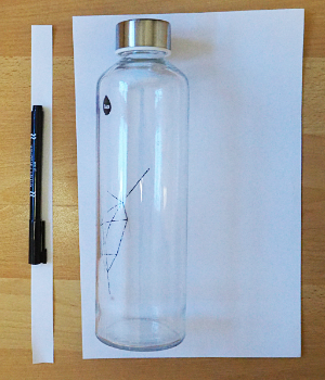 Stelle die Flasche oder das Glas auf ein Blatt Papier. Ziehe am Blatt Papier. Achte darauf, dass das Blatt Papier flach gehalten wird. Die Flasche oder das Glas bleibt auf seiner Position stehen.