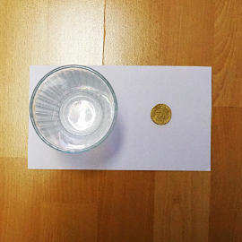 Gib das Blatt Papier auf das Glas, sodass es geschlossen ist. Lege die Münze auf das Papier. Ziehe am Papier und die Münze fällt in das Glas.