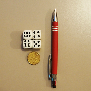 Stelle zwei Würfeln aufeinander, dann die Münze auf die zwei Würfeln und dann weitere zwei Würfeln auf die Münze. Schlage mit dem Druckknopf des Kugelschreibers die Münze aus dem Stapel, sodass die vier Würfeln aufeinander stehen bleiben.