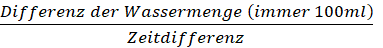 Auf Papier: In der Tabelle sind nun Zeit und Wassermenge gegeben. Berechne die Zeitdifferenz zwischen den 100 ml-Schritten. Beobachte dabei, dass die Zeitunterschiede sehr ähnlich sind. Zusätzlich kannst du die Geschwindigkeit mit der Formel